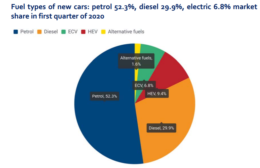 受疫情影响,许多汽车经销门店关闭,欧洲车市在今年3月进入“急冻”状态。欧洲汽车工业协会(ACEA)近日发布数据表示,同期欧盟、英国和欧洲自由贸易联盟(EFTA)成员国的乘用车总销量下降了53%。根据ACEA的报告,在今年前三个月登记的305万辆新车中,52%是汽油车,28%是柴油车。